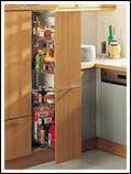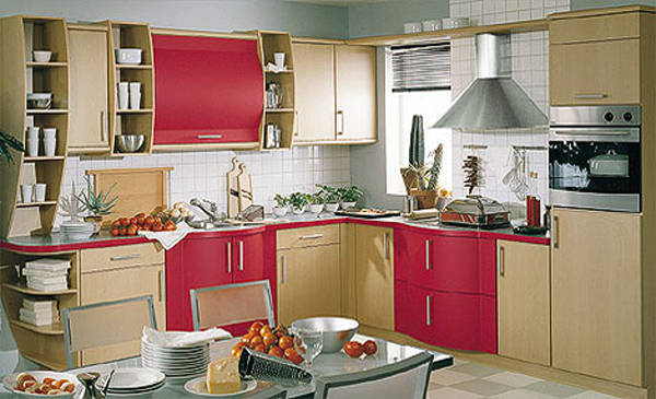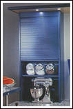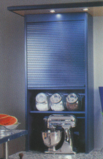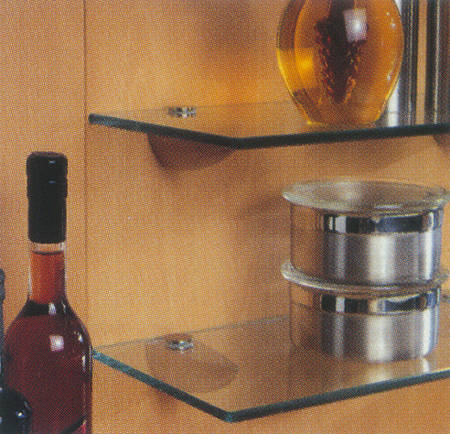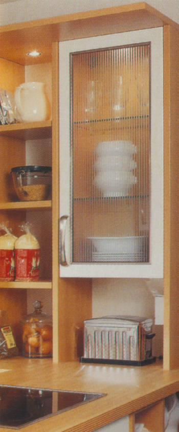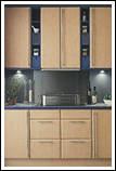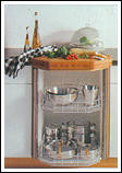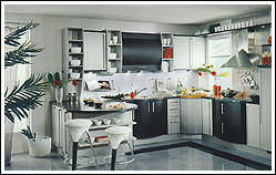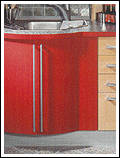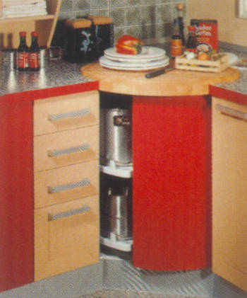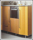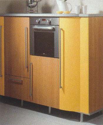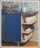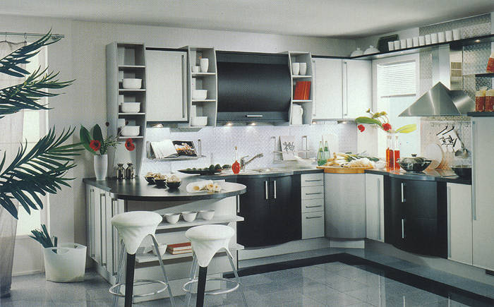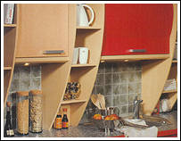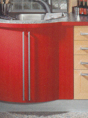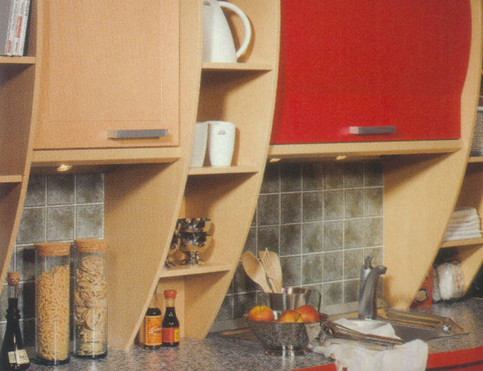Dynamisch geschwungene Fronten werden zum Blickfang - praktisch und sehr komfortabel - passend gebogene Regale für jede Menge Platz.