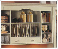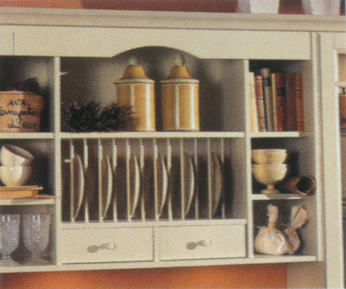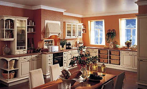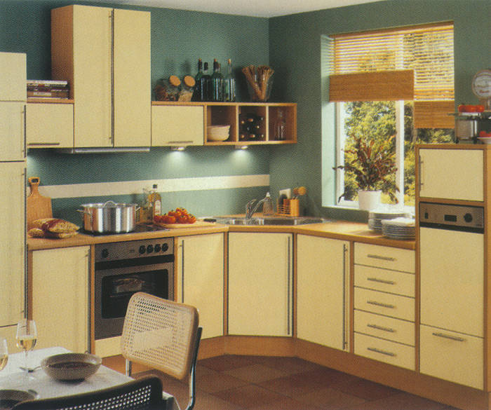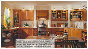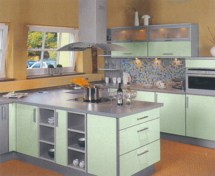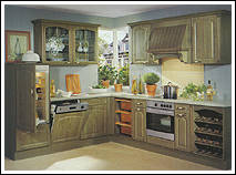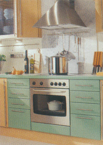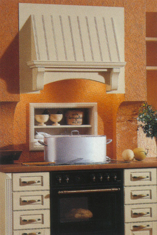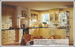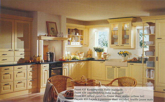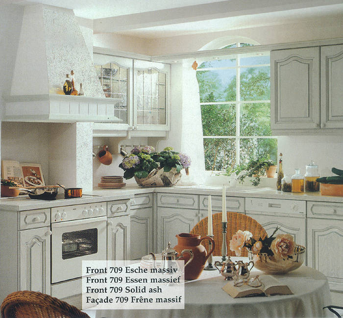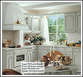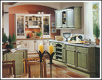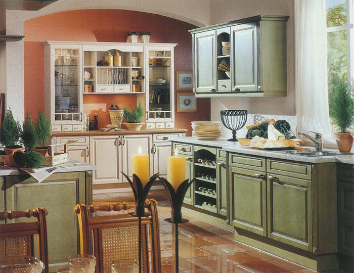 ... hier in grün, vanille und Dekor abgebildet, besticht durch liebevoll gestaltete Details, die das Flair der Landhausküchen ausmachen.