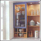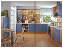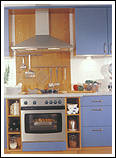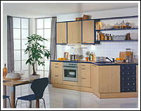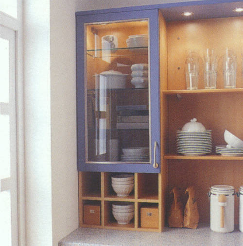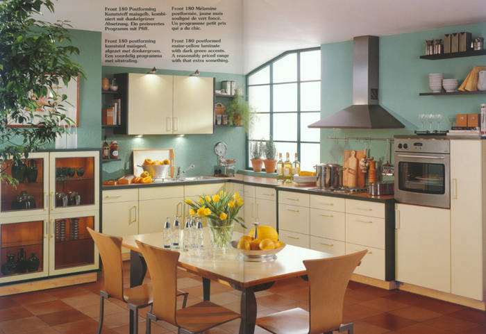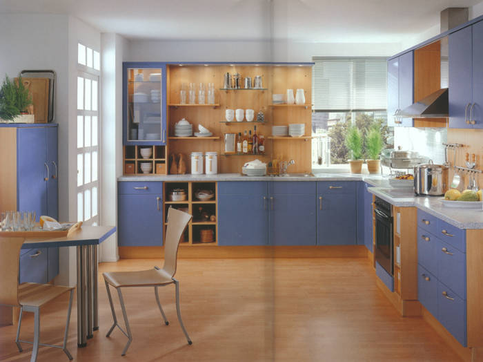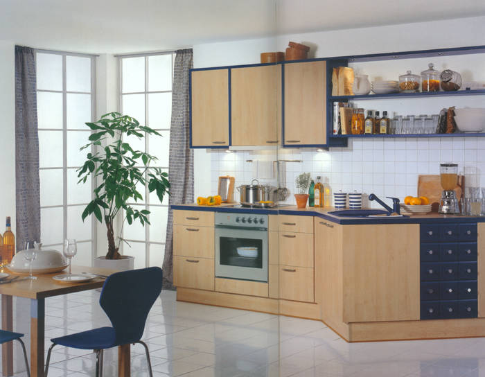 Front 181 Postforming Kunststoff taubenblau. Eine frische Kombination mit Buche-Dekor im Nischenbereich. Das Zubehör und die