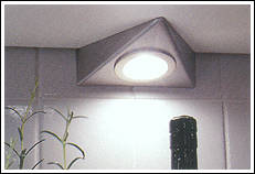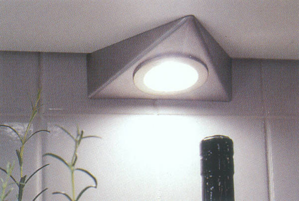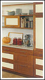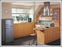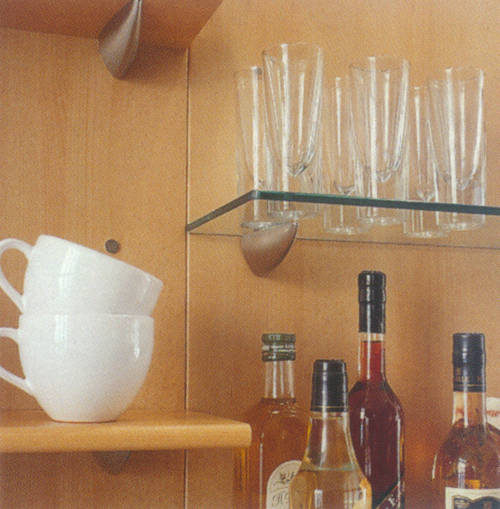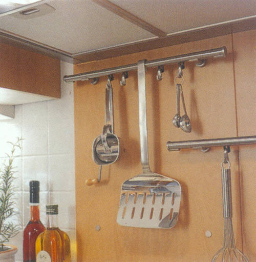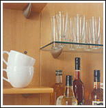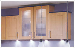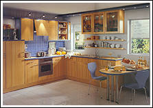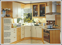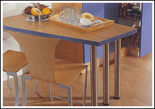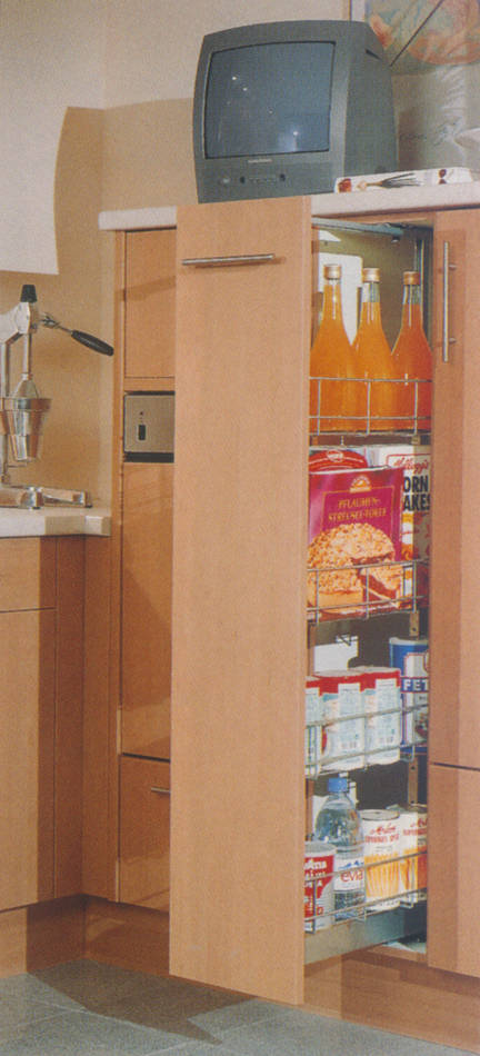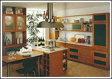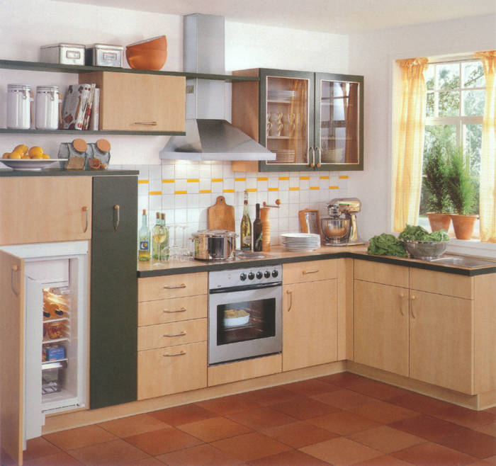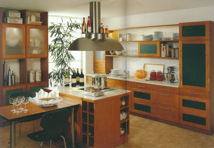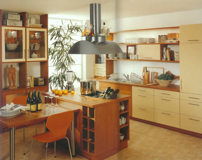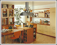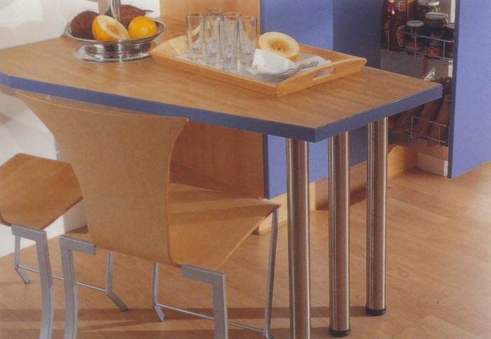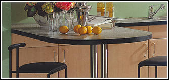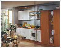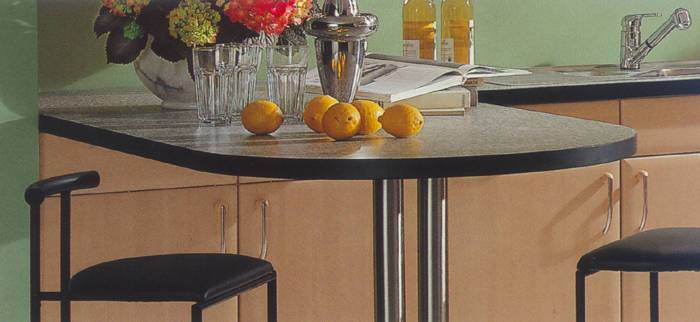 Ahorn- Dekor mit zierlichen Bügelgriffen und Akzentfronten in Alu-Optik. Praktisch ist die in den Raum ragende allseitig zugängige Arbeitsplatte. |