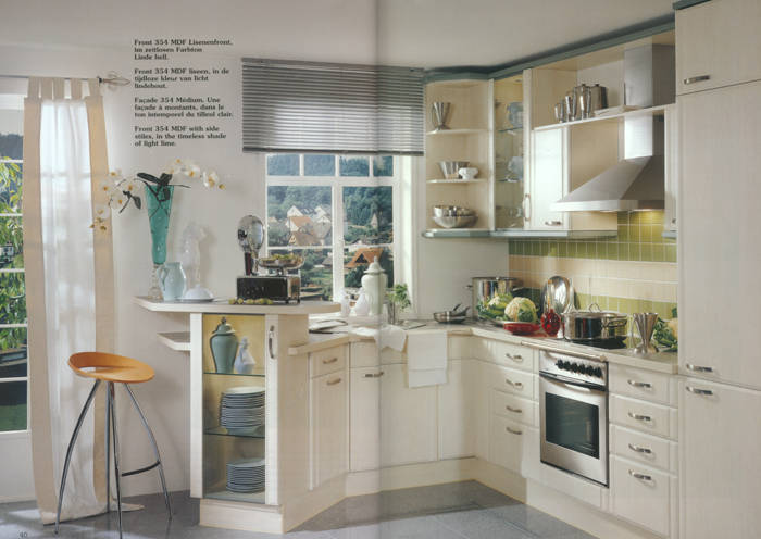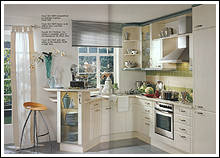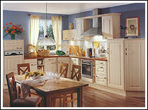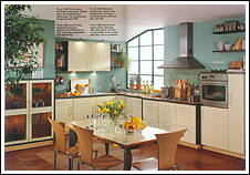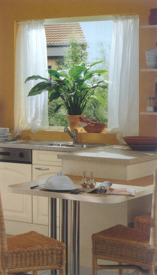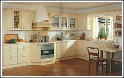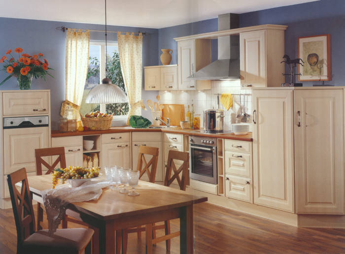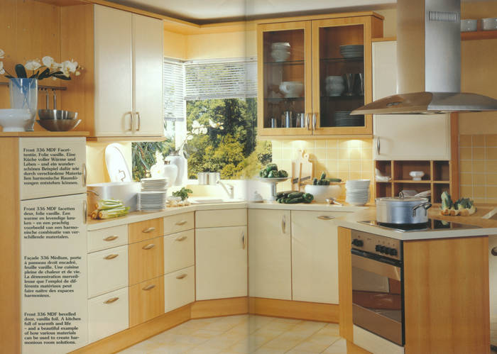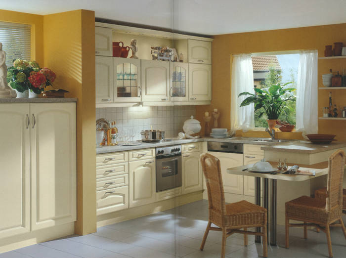 Front 388 MDF Stilbogen. Folie vanillefarbig. Ganz trendgemäß auf Wohnlichkeit und individuellen Lebensstil zugeschnitten ist diese Landhausküche. |