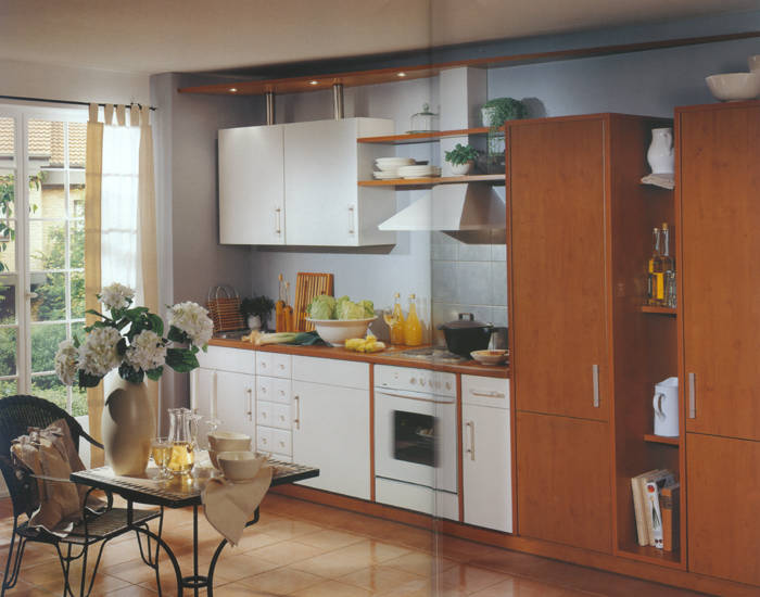 Front 272 Folie Ahorn tabak mit Samtoberfläche. Eine interessant geplante Küche mit Midischränken und offene Gestaltung im Hängeschrankbereich.